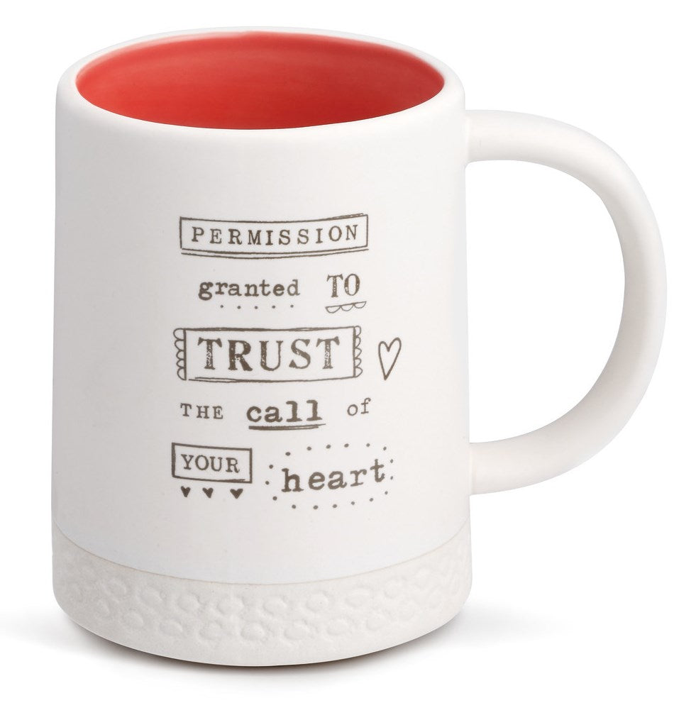 This new stoneware mug by Kelly Rae Roberts for 2019 is one worth having.You are sure to enjoy your cup f coffee from this mug.The outside of the mug is off-white with a crochet textured border, and the interior is salmon color. The 12 oz mug is made from stoneware and measures 4.5"w x 2.5"d x 4"h. This mug is microwave safe and dishwasher safe.The trust Mug reads: Permission granted to trust the call of your heart.
