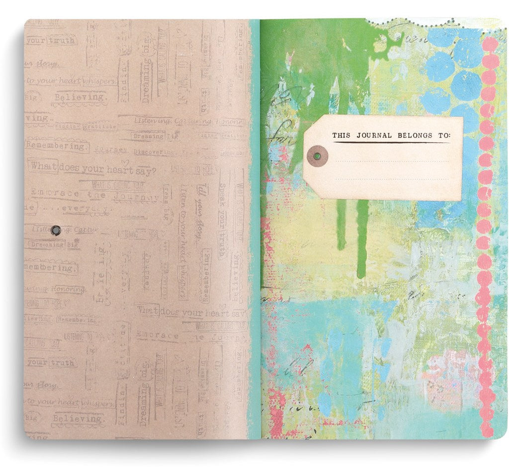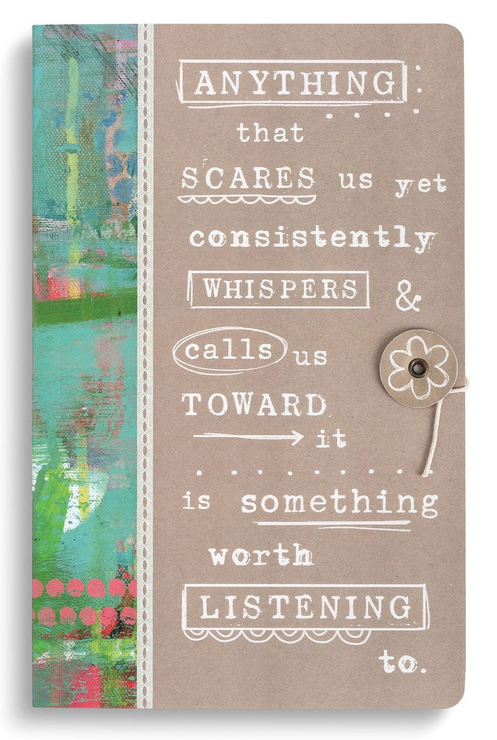 Kelly Rae Roberts has added some new paper journals to her line. This journal includes the sentiment: Anything that scares us yet consistently whispers and calls us toward it is something worth listening to. Just inside the cover of this journal there is a place to mark a Gift note and add: This journal belong to:____ The journal measures 5" w x 8" tall when closed. It has a metal rivet to hold the closure button and a cord to wrap around the closure when you wish to keep your journal closed. The journal has 100 lined pages to write your special thoughts.
