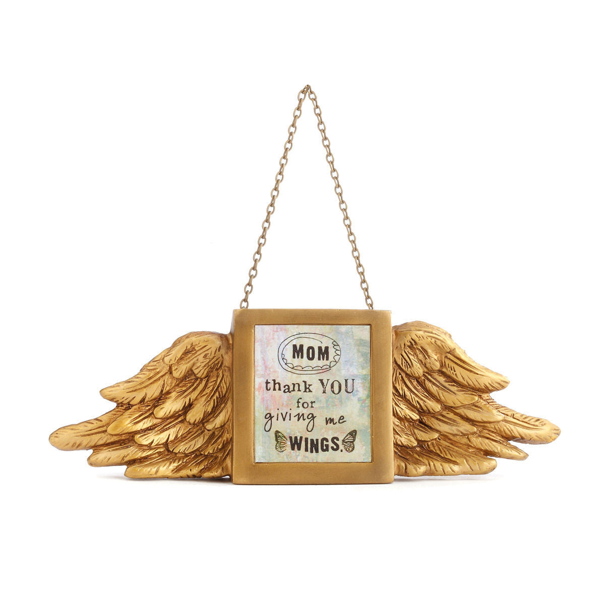 Kelly Rae Roberts has created a new line of 'wing sculptures' that make the perfect gift. The wings are 5 1/2" wide and 1 1/2" tall and 1/2" thick. Hanging or on a shelf they are a great addition to any collection. They are made of resin with a metal chain and come in a darling gift box. This one is for Mom. It reads: Mom thank you for giving me wings.